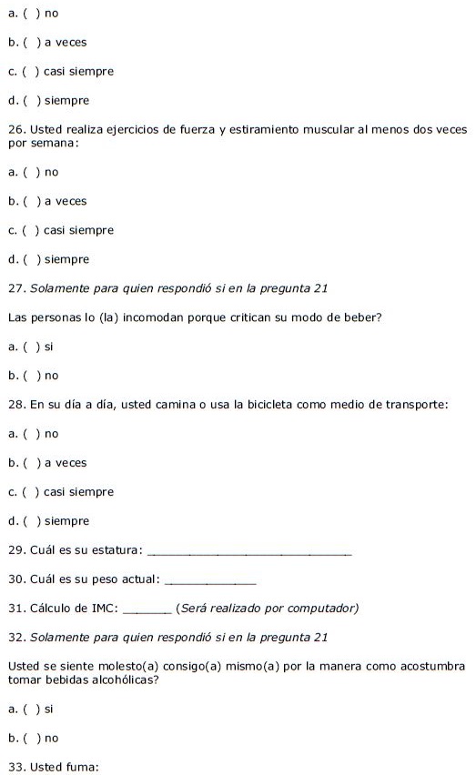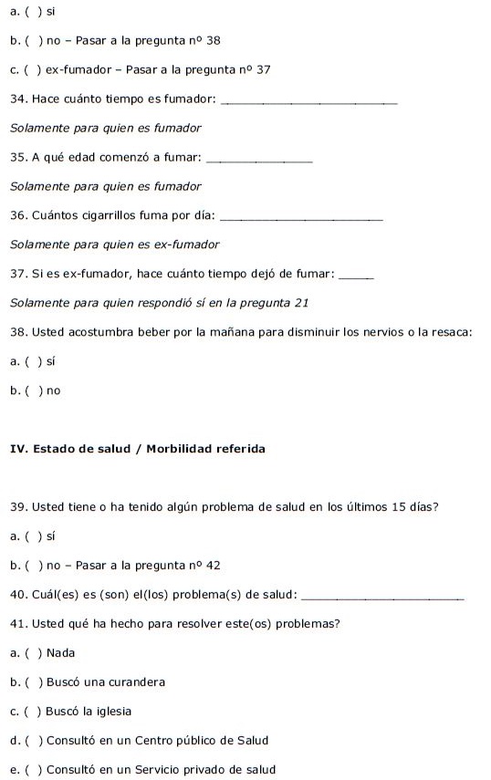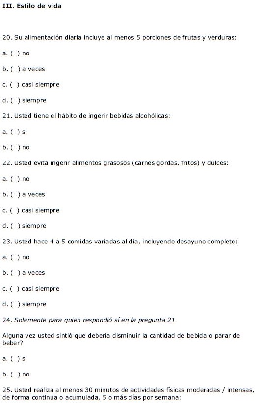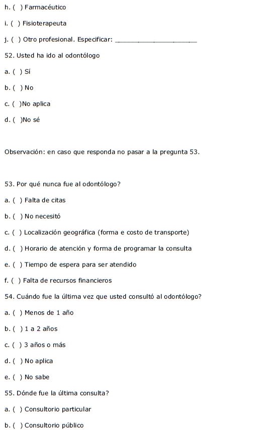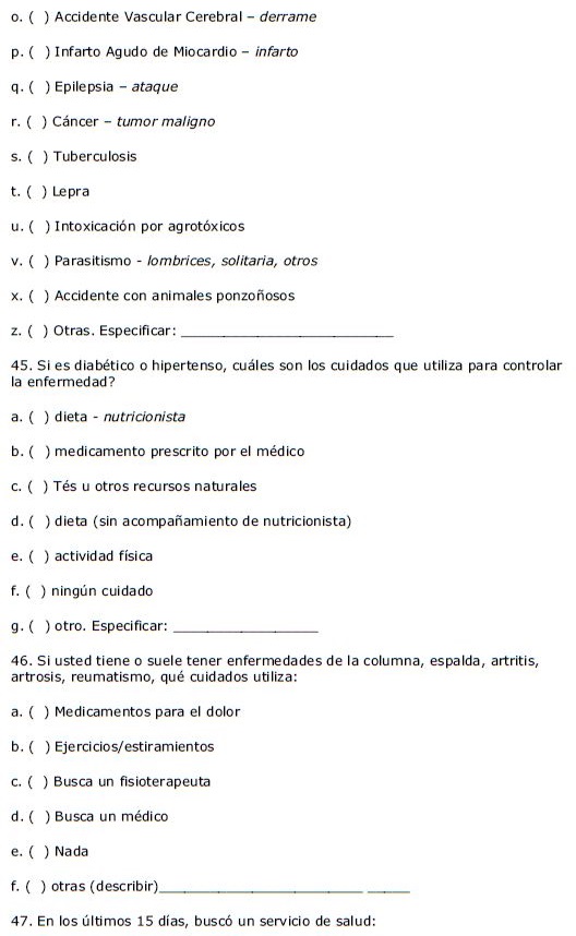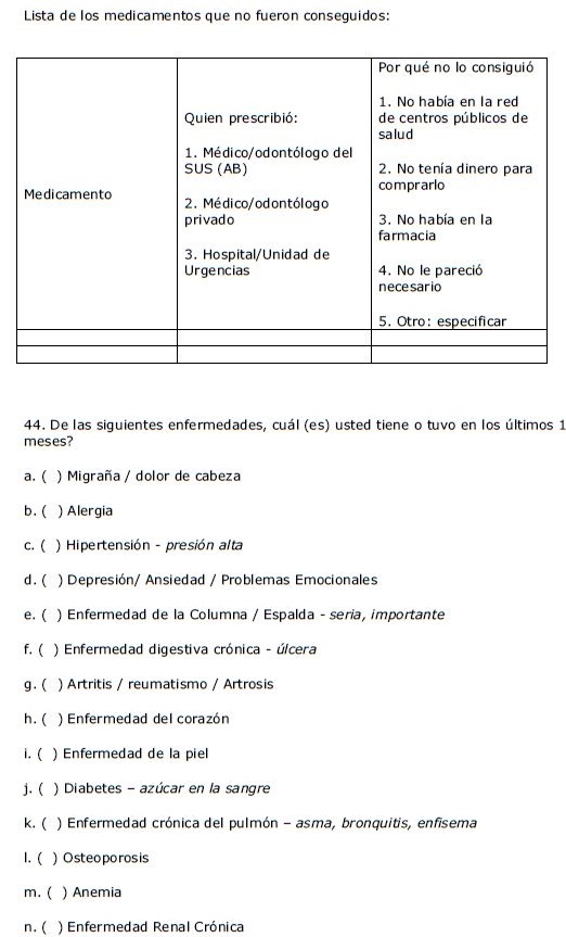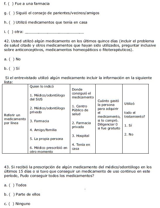 El instrumento aplicado se diseñó en base a cuestionarios aplicados previamente en la Encuesta Multicéntrica de Salud en el Estado de São Paulo-ISA/SP11 y en la Encuesta Domiciliaria de Acceso y Uso de Medicamentos de la Evaluación de la Asistencia Farmacéutica en Brasil.12 Para la validación, la primera versión del cuestionario se aplicó a personas que no habían sido incluidas en la muestra para verificar si las preguntas eran claras. Luego de realizar los ajustes necesarios, la versión final del cuestionario se aplicó a las personas incluidas en la muestra.