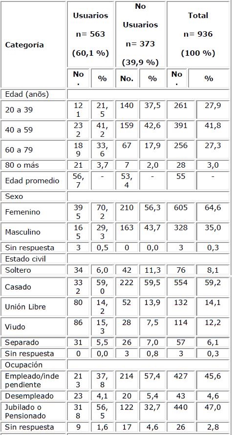 Las características de los 936 entrevistados se encuentran en la tabla 1. Del total de entrevistados, 563 (60,1 %) respondieron que habían utilizado medicamentos en los últimos 15 días.