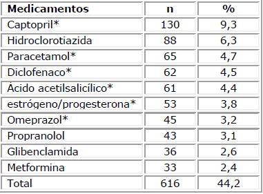Results: Out of those interviewed, 60.1% reported having used medications in the last 15 days. There was a greater probability of drugs using in women, people over 40 years old and pensioners (p< 0.05). Out of the 1 393 drugs used, 16.4% were used in a self-medicated way, mostly non-steroidal anti-inflammatory drugs. 98.8% of the medicines belonged to the Municipal List of Essential Medications, which are prescribed by physicians of the System and that were obtained by the users in the Basic Health Units. The average number of drugs per person was 2.5. The 104 drug users had 118 drug interactions (an average of 1.7 interactions per user), and the risk of interaction increased with the number of drugs used.