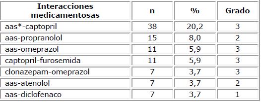En el caso de la relevancia clínica de las interacciones, los resultados obtenidos coinciden con los de Silva,35Okuno,36 y colaboradores, quienes encuentran mayor frecuencia de IM de grado II, aunque también estudian el uso de medicamentos en pacientes hospitalizados. Cabe destacar que la mayoría de las interacciones encontradas en este estudio estaban asociadas al ácido acetilsalicílico y a medicamentos antihipertensivos, que puede traer como consecuencia la reducción del efecto antihipertensivo.16 La alta frecuencia de uso de ácido acetilsalicílico, cuya utilización debería tener un seguimiento desde las políticas de uso racional y los programas de farmacovigilancia, pues, este es un medicamento de venta libre, que es utilizado en la prevención primaria y secundaria de Infarto agudo de miocardio, aun cuando la evidencia señala que los beneficios solo son menores que los riesgos de reacciones adversas y el alto potencial de IM en el caso de la prevención secundaria.37