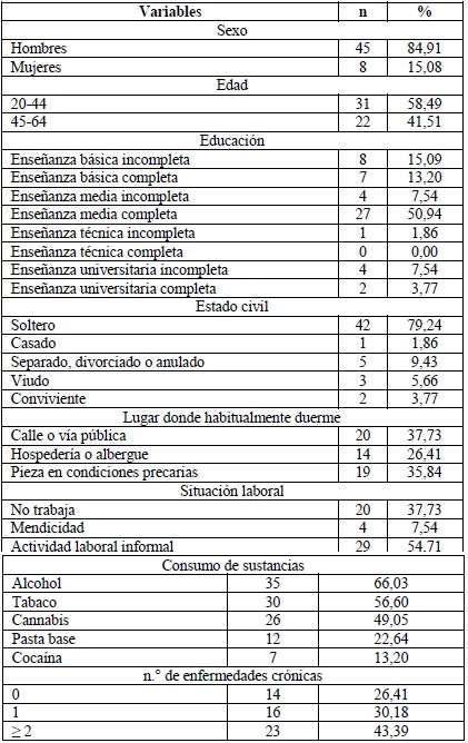 En este estudio 55 usuarios cumplían los criterios de inclusión, de ellos 2 usuarios decidieron no participar al momento de firmar el consentimiento informado. La muestra para el análisis fue de 53 usuarios, 84,91 % fueron hombres y 15,08 % mujeres. La edad promedio fue de 41,84 años, ± 11,75 desviaciones estándar (DE), con un rango de 21-64 años; 79,24 % eran solteros. El 28,29 % cursó ocho años o menos de estudios, 58,48 % entre nueve y doce años y 13,17 % más de doce años de estudio, dos de ellos declararon estudios universitarios completos. El 64,14 % duerme habitualmente en la calle, vía pública o albergues, los restantes arriendan piezas en condiciones precarias. El 49,05 % no se relaciona con familiares y 75,47 % no recibe ayuda económica, afecto o compañía de ellos. Respecto a la situación laboral, 54,71 % realiza actividades informales sin contrato, 7,54 % se dedica a la mendicidad y 37,73 % no trabaja. En relación al reporte de enfermedades previamente diagnosticadas por un profesional de la salud: 64,15 % declara padecer de depresión, 35,84 % de hipertensión arterial, 11,32 % de enfermedad pulmonar obstructiva crónica, 7,54 % de esquizofrenia e igual porciento de epilepsia. El 43,49 % de los encuestados padece dos o más enfermedades crónicas. La sustancia psicoactiva de mayor uso es el alcohol (66,03 %), según el AUDIT, el 45,28 % no lo consume o declara un consumo de bajo riesgo, mientras que el 54,71 % presenta un consumo riesgoso (tabla 2).