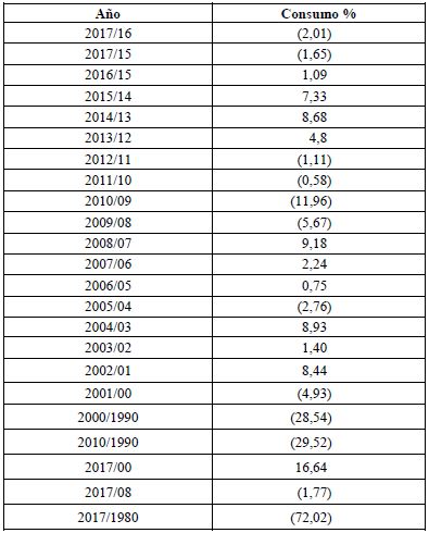 El consumo percápita de cigarrillos en el año 2017 decreció 2,01 %, 45 cigarrillos menos que en el año 2016. Esta modificación se produce luego de un incremento sostenido desde el año 2012. En el 2016 tal incremento resultó mucho menor en comparación con el año precedente, cuando se fumaron 112 cigarrillos más que en el 2014. Con anterioridad a esa fecha, desde 1997 que se contuvo la tendencia decreciente con la menor cifra alcanzada (1 196 cigarrillos), se producían oscilaciones en las ventas que no permitían marcar una tendencia. El año 2017 puede constituir el inicio de un cambio hacia una tendencia decreciente.
