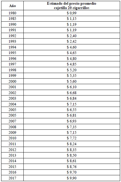 En el año 2017 el precio promedio estimado de la cajetilla de cigarrillos fue de $ 9,90 CUP, (tabla 3) lo que equivale a $ 0,40 CUC y $ 0,48 USD de acuerdo a la tasa de cambio oficial vigente por el Banco Central de Cuba, en el momento del estudio.