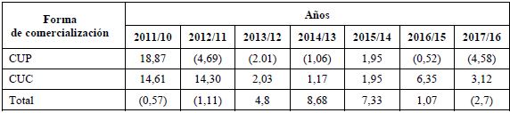Un análisis comparativo con los años 2011-2017, pone de manifiesto el decrecimiento en el mercado en CUP, superior a los años anteriores y muy similares al 2012. Solo en el 2015, el incremento se produjo en las dos formas de comercialización (tabla 5).