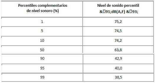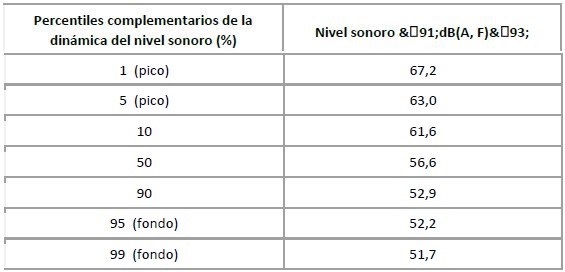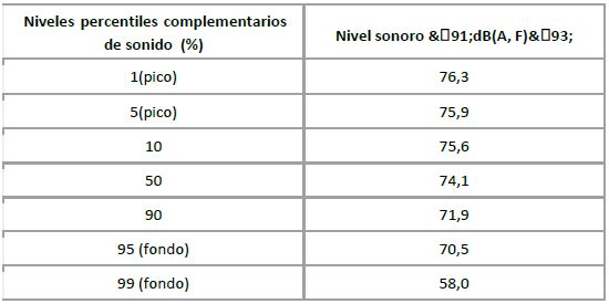 De acuerdo con la tabla 1, es posible considerar un rango dinámico interpercentil (P05- P95) de 34,5 decibeles fisiológicos de valor eficaz 125 mseg &(91;dB(A,F) &(93;, el cual revela un campo de sonido temporal no continuo (fluctuante).