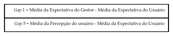 3: cálculo dos gaps 1 e 5]A busca identificar os gaps mais críticos, ou seja, aqueles em que a percepção de qualidade do gestor seja inferior à percepção por parte do cliente. Após a identificação das dimensões e atributos mais críticos, são elaboradas estratégias a partir de debates com os gestores e os especialistas da área, visando a melhoria da qualidade deste serviço de uma forma geral. A Figura 1 apresenta as etapas do método e suas respectivas atividades.