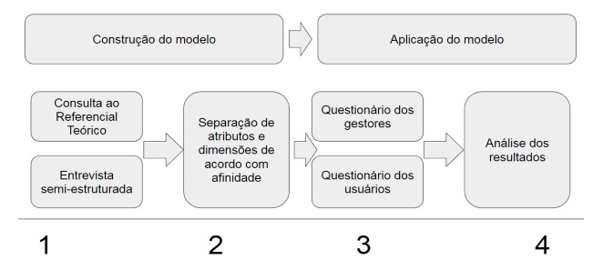 Baseando-se nos modelos de avaliação da qualidade percebida em serviços de autoatendimento, descritos na seção 2, este tópico busca apresentar etapas do método de pesquisa utilizadas durante o desenvolvimento do trabalho. Desta forma, os procedimentos foram estruturados em quatro etapas: i) levantamento de dimensões e atributos de qualidade percebida em serviços de autoatendimento online; ii) desenvolvimento do instrumento de coleta de dados; iii) aplicação do instrumento em usuários e gestores do tipo de serviço avaliado e, iv) análise de resultados e proposta de melhorias.