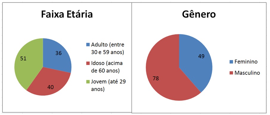 Para a obtenção de uma amostra mais detalhada, o total de questionários aplicados é de 100. A definição das classes de idade se dá de acordo com o Estatuto da Juventude (Código Penal Brasileiro, Lei 12.852, 2013) e do Estatuto do Idoso (Código Penal Brasileiro, Lei 10.741, 2003): jovens entre 15 e 29 anos, adultos entre 30 e 59 anos e idosos acima de 60 anos de idade.