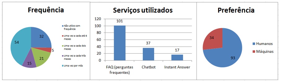 Além de coletar informações sobre o perfil dos usuários, também foram realizadas perguntas sobre a frequência que os mesmos utilizam os serviços de autoatendimento online, bem como quais foram estes serviços e sua preferência por atendimento humano ou através de máquinas. A Figura 3 apresenta os resultados obtidos nessa análise.