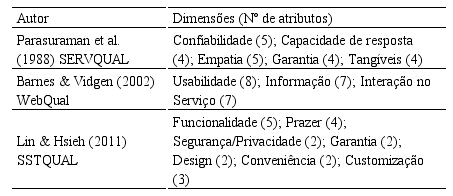 A Tabela 1 apresenta alguns dos modelos de avaliação de qualidade em serviços desenvolvidos por seus autores, expondo as dimensões consideradas por cada autor e o número de atributos (entre parênteses), bem como o nome do modelo proposto.