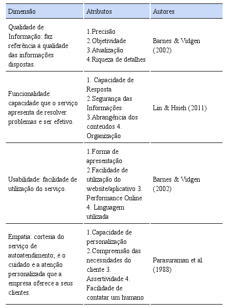 Na etapa dois, a lista de atributos foi organizada em planilha Excel, foram analisadas as semelhanças e eliminadas redundâncias. Após isso, foram organizados em dimensões, conforme afinidade. Para a construção do instrumento foram transformados em questões a serem avaliadas pelos respondentes, utilizando uma escala Likert de 7 pontos, onde 1 significa discordo totalmente e 7 representa concordo totalmente. O questionário avaliou a expectativa e a percepção dos usuários em cada atributo. O mesmo questionário é aplicado a gestores deste tipo de serviço. As dimensões e atributos selecionados para a construção do instrumento de avaliação de qualidade percebida em serviços de autoatendimento, são mostrados na Tabela 2.