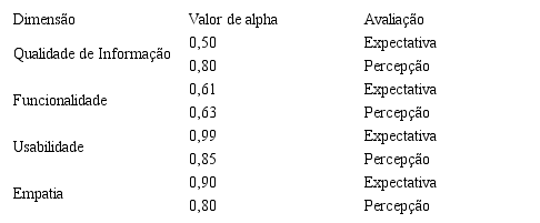 Os dados coletados da pesquisa foram submetidos a uma análise estatística para avaliar a confiabilidade do instrumento construído através do coeficiente de alpha de Cronbach. Cada uma das quatro dimensões foi avaliada tanto nas respostas referentes à expectativa quanto nos referentes à percepção. Os valores calculados estão apresentados na Tabela 3.