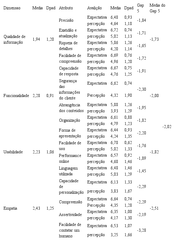 A análise descritiva dos valores de expectativas e percepções de clientes e gestores, permitiu a identificação de alguns fatores que têm grande influência na baixa avaliação de qualidade nos serviços de autoatendimento relatada pelos usuários. O fato dos gestores não perceberem o desejo dos usuários de entrar em contato com um humano, quando uma máquina não atende às suas necessidades ficou evidente neste estudo. O atributo “Performance Online” também foi destaque, visto que obteve o maior gap 5, ou seja, os usuários julgam ser muito importante, enquanto os gestores não percebem o mesmo valor. Outro atributo que podem ser destacados neste trabalho são Capacidade de Personalização, que obteve gap 1 positivo de 0,87 e gap 5 negativo de -1,89, provando que os usuários não percebem tanto valor quanto os gestores e mesmo assim não atendeu às expectativas.