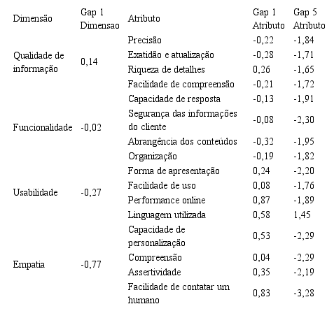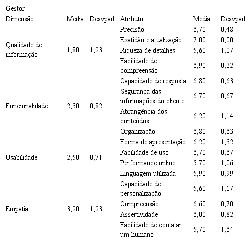 Paralelamente ao questionário aplicado aos usuários, gestores responderam a outro questionário, onde foram realizadas perguntas sobre o que eles imaginavam que seus clientes esperam dos serviços de autoatendimento online. Esses questionamentos foram tanto para avaliar as dimensões como um todo, quanto para avaliar individualmente cada atributo. A Tabela 5 apresenta os resultados obtidos neste questionário.