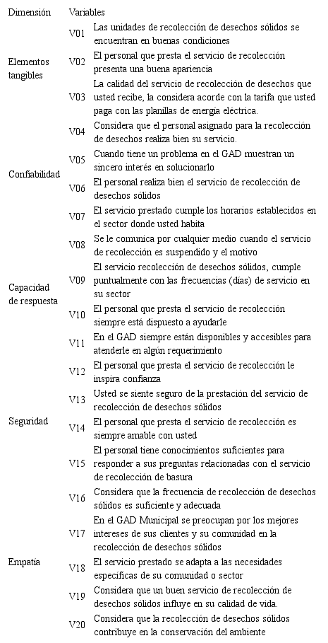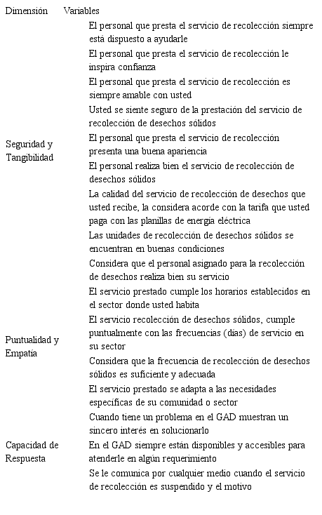 Para identificar los factores que determinan la calidad de los servicios de recolección de desechos sólidos que presta la Dirección de Higiene y Ornato del GAD Municipal de Milagro, se usará una adaptación de la escala propuesta por Chou et al. (2010), que a su vez es una versión de la escala SERVQUAL propuesta por Parasuraman, Berry & Zeithaml (1988), y el SERVPERF (Service Performance) desarrollado por Cronin & Taylor (1992); y que ha sido validada en otros contextos y por otros autores (Meza-Morales, et al. 2017; Sáez, 2011; Sáez, Machado & Godoy, 2011).