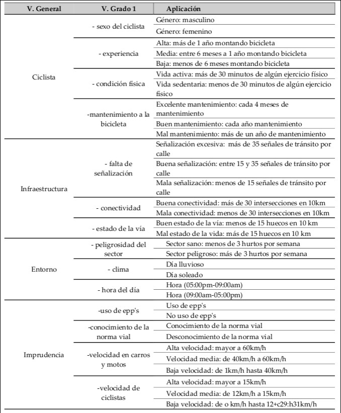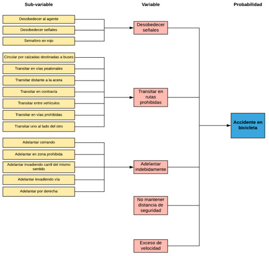 Abstract: Bogotá became one of the leading cities in the use of bicycles as a means of transport. Currently, no studies are reported on the factors that affect the accident rate; Some 60 cyclists were killed and 715 injured by 2015, a rate that increased 7% compared to the previous year. There are only statistics on injuries and deaths. Without this type of analysis, public policies or welfare strategies can not be proposed to influence the causes of accidents, either from the frequency of occurrence or from the perspective of the severity of the damage. The Mobility Secretary has a record of occurrence for each accident, but this is not integrated, so in this article we present the analysis of the behavior of influential factors when an accident occurs. These factors were obtained from a bicycle accident database provided by the mobility secretary of Bogotá, additionally, primary information was collected from 280 frequent bike users in Engativá; a data treatment was carried out, prioritized through the Vester matrix and analyzed in a probability tree; as a result, the tree shows 5 basic variables for the occurrence of a bicycle accident. INTRODUCCIÓN
