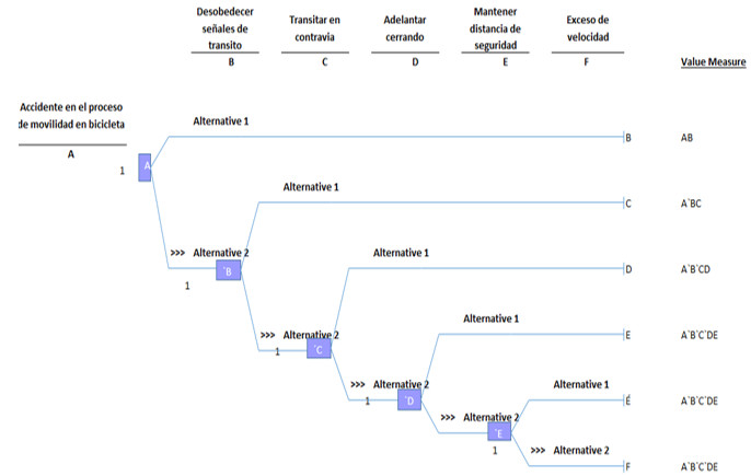 Las técnicas que se utilizan en ingeniería industrial para la representación de procesos y procedimientos, no alcanzan a representar la complejidad del proceso y los riesgos de movilidad en bicicleta. Se deben implementar otras metodologías, cómo emplear la NTP 328 el análisis de riesgos mediante el árbol de sucesos, puesto que por medio de un diagrama gráfico a partir de sucesos desencadenantes indeseados se puede averiguar la probabilidad de un evento, en este caso del accidente; por lo tanto, esta metodología es la que más se adapta al proceso de movilidad en bicicleta.