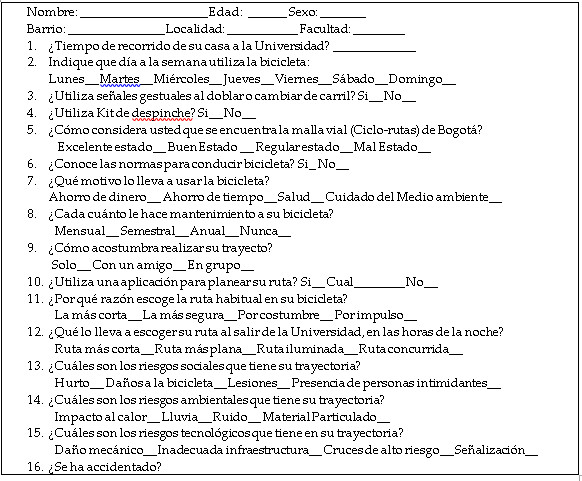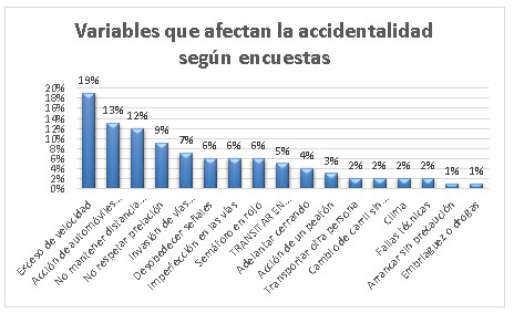 La encuesta 1, presentada en la Figura 2, se realizó de la siguiente manera; por medio de preguntas que arrojaran variables demográficas, de comportamiento y geográfico, para saber cuáles sirven para definir accidentalidad y otras para definir riesgos. En esta se estudió la cantidad de variables y eventos asociados a estas variables las cuales generaban accidentes.
