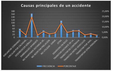 Según el estudio realizado por la secretaria de movilidad del 2016 (Universidad de los Andes (Grupo de Estudios en Sostenibilidad Urbana y Regional - SUR), Cámara de Comercio de Bogotá, 2016 ), las tres(3) variables con más influencia en un accidente son desobedecer señales (el cual comprende cuando hacen caso omiso a las señales de tránsito), adelantar cerrando (cuando se está adelantando un carro moto o bicicleta sin dejar una distancia prudente entre el otro vehículo y la bicicleta) y transitar en contravía, tal y como se evidencia en la figura 4 con sus respectivas frecuencias y porcentajes de participación.