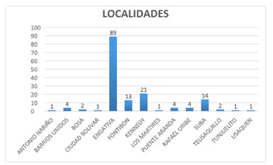 Con base en los resultados de la encuesta No. 2 se obtuvo que el 56% de la población de biciusuarios encuestados viven en la localidad de Engativá y el 53% de los accidentados también viven en esta localidad, lo cual ratifica que Engativá es la localidad con más población y con más accidentalidad en este estudio, como se evidencia en la figura 6.