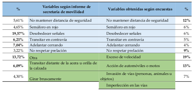Las variables resaltadas en verde fueron las variables en las que diferían los dos estudios, pero que de igual manera eran representativas para este proyecto. Exceso de velocidad es una variable que tiene un alto porcentaje en la información primaria, pero que en la información secundaria no se encuentra dentro de una de las variables más influyentes, estas diferencias son importantes para este estudio, para conocer realmente las variables influyentes.