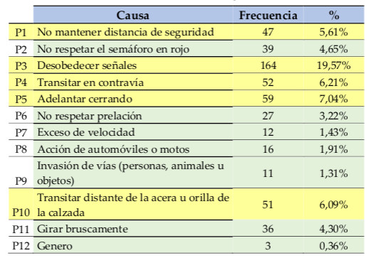 Con el fin de centrar el estudio a las causales principales de un accidente, se realiza un análisis de factores según los resultados del reporte de la secretaria de movilidad, teniendo en cuenta el porcentaje de ocurrencia de cada uno (Secretaria de Movilidad, 2016). De este análisis se determinó que no mantener distancia de seguridad, desobedecer señales, transitar en contravía y transitar distante de la acera u orilla (tabla 3) son las causales más primordiales a tener en cuenta según el criterio de tomar aquellos factores superiores a 5.5%; esto aplicando la fórmula 2.
