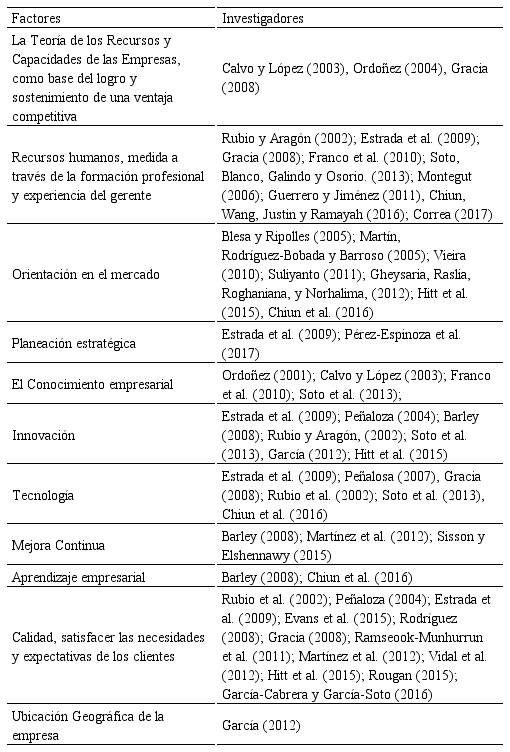 De las investigaciones anteriores, las organizaciones para poder mantenerse en el mercado y lograr cumplir sus objetivos empresariales y mantenerlos, se resalta la necesidad de buscar una ventaja competitiva que permita sobresalir a la competencia, para ello existen diferentes factores internos que pueden constituirla y los cuales se listan en la tabla 2.
