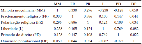 Em termos de religião, a restrição religiosa está associada diretamente aos muçulmanos, aos cristãos ortodoxos e às minorias muçulmanas e inversamente aos cristãos não ortodoxos, como se previra. Nas outras variáveis independentes, a restrição associa-se inversamente à diversidade religiosa (fracionamento e polarização), à liberdade e ao primado do direito e diretamente à dimensão populacional, como se previra, excetuando a polarização religiosa. Para as outras variáveis, não houve resultados significativos: o desenvolvimento humano e o fracionamento étnico têm correlações praticamente nulas, enquanto a polarização étnica parece associada a maior restrição, pelo menos governamental.