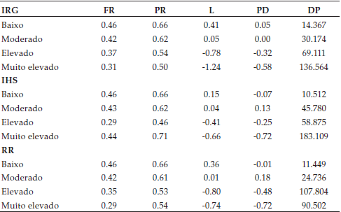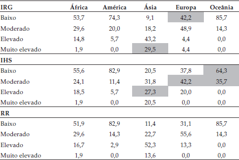 A percentagem maior do cluster ‘baixo’ está na Oceania, para IRG e RR, e América para IHS, enquanto a percentagem menor está na Ásia. A percentagem maior do cluster ‘moderado’ está na Europa, enquanto a percentagem menor está na Oceania, para IRG, na América, para IHS, na América/Oceania, para RR. As percentagens (maior e menor) dos clusters ‘elevado’ estão na Ásia e Oceania respectivamente. A percentagem maior do cluster ‘muito elevado’ está na Ásia, enquanto a percentagem menor está na América/Oceania, para IRG, na América/Oceania/Europa, para IHS e RR.