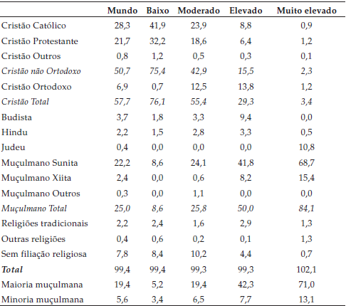 O peso de cada religião varia de acordo com o cluster (Tabela 6). Mais uma vez, os resultados para IRG e IHS não são mostrados. A percentagem de cristãos não ortodoxos diminui do cluster ‘baixo’ para o cluster ‘muito elevado’, enquanto o maior peso nos ortodoxos ocorre nos clusters ‘elevado’ e ‘moderado’. Budistas e hindus aumentam do cluster ‘baixo’ para o cluster ‘elevado’, sendo nulos ou praticamente nulos no cluster ‘muito elevado’, enquanto os judeus só têm peso no cluster ‘muito elevado’. A não filiação diminui com o aumento da restrição religiosa. Os muçulmanos (sunitas e xiitas) aumentam do cluster ‘baixo’ para ‘muito elevado’. O peso das religiões tradicionais oscila ao longo dos clusters. O peso de outros muçulmanos e outras religiões é diminuto. O peso das pessoas sem filiação religiosa aumenta até ao cluster ‘moderado’ baixando a partir daí. Tanto a maioria como a minoria muçulmana aumentam do cluster ‘baixo’ para o ‘muito elevado’.