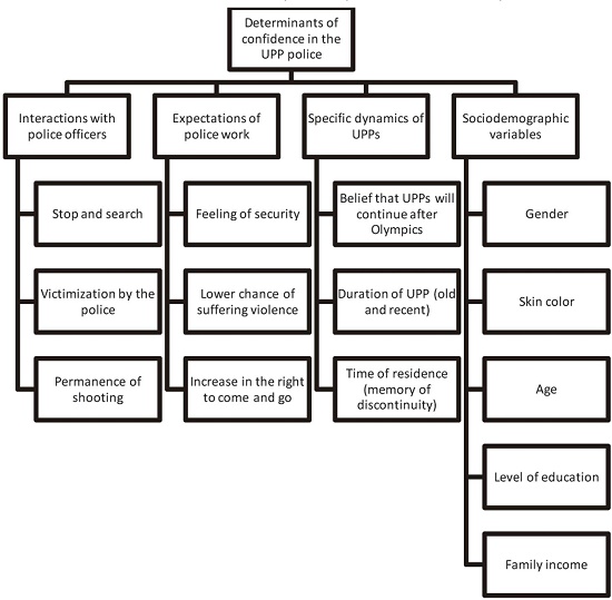 In this article, we seek to understand the determinants of confidence in the UPP police as a way of elucidating the elements which contributed to this program to be simultaneously desired and repelled by those who experienced it daily. In this posthumous assessment of the determinants of confidence in the UPP police, we wanted to identify the points that collaborated to a positive assessment of the police action, which can serve as the basis for the next experience of community approximation, as it tends to occur in Rio de Janeiro ( McCann, 2013 ).