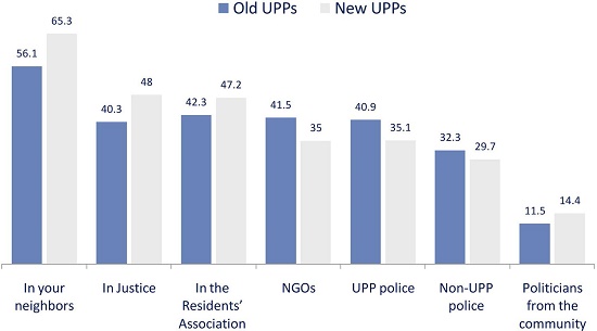 In the survey, we found that 31% of respondents said that they had (much or little) confidence in the PMERJ police (in general), while 38% stated that they had (much or little) confidence in the UPP police. On average, the confidence in the UPP police was seven percent higher than in the PMERJ police. In Figure 1 , it can be seen that the differences are much more substantial in the old UPPs: 40.9% confidence in the UPP police versus 32.3% for the non-UPP police. Even in recent UPPs, the difference is not insignificant: 35.1% have confidence in the UPP police while 29.7% have confidence in the non-UPP police.