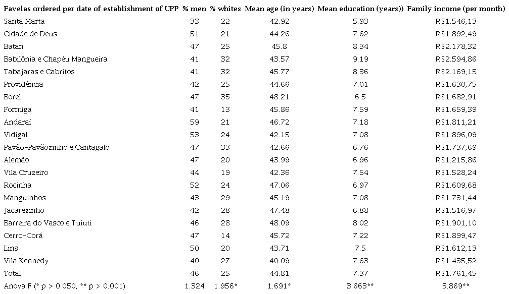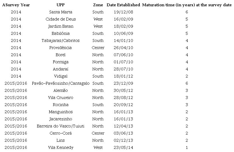 The data analyzed in this paper resulted from 2,000 domiciliary interviews carried out with individuals over 18 years of age, equally distributed among the first 10 favelas (called old UPPs) and the 10 most recent favelas (called recent UPPs) that received Police Pacification Units10 . We decided to construct these two groups due to the presence of the accommodation effect, when the “novelty” of the police came to be part of daily life in favelas (Oliveira, 2014). Examining the first UPPs means dealing with the effects of the UPP policy in the locations where it had become established ( Fleury, 2012 ), due to the understanding that the greatest problems of “pacification” were concentrated in the UPPs established in latest years ( Rodrigues, 2014 ). The researched favelas , as well as the date of the interviews, are shown in Table 1 .