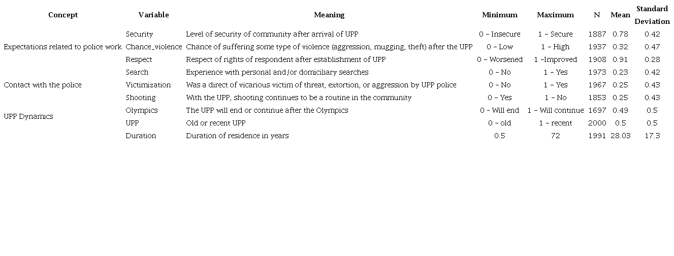 With this recoding, the purpose of this study is to understand the variance in the odds ratio of the trust in the UPP policemen according to the phenomena that, in international and national literature, explain this relationship: a) experience of subjects with the police (approach, victimization by the police, and experience of shooting), b) expectations they place on police work (in terms of the prevention of crime and the reduction of fear) and c) sociodemographic variables (which reinforced interactions and beliefs about police actions). Considering the UPPs characteristics, a group of variables about the maturation of “pacification” was added, which were: d) length of time of the UPP at the survey date, e) belief that the project would continue after the Olympics, and f) length of residence in the community, which could indicate the memory of discontinuity of community policing projects ( Rodrigues and Siqueira, 2012 ).