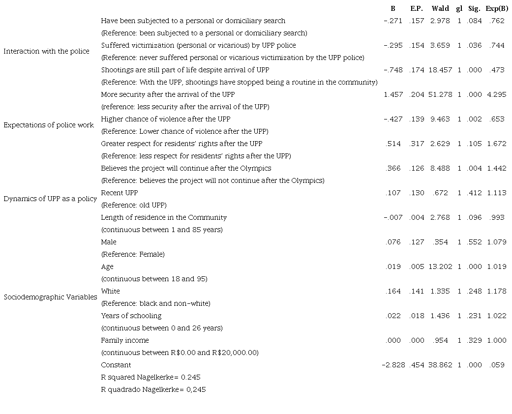 It is thus impossible to assert the existence of a public policy strictly speaking ( Rodrigues and Siqueira, 2012 ), reinforcing the perception that the ‘pacification’ depended directly on the interactions between residents and police ( Rodrigues, 2014 ) and the benefits that people saw in the presence of police in the favela (Cano, Borges and Ribeiro, 2012). To understand how these factors combined and explained the likelihood of confidence in the UPP police, a binomial logistic regression model was estimated. The results can be seen in Table 4 .
