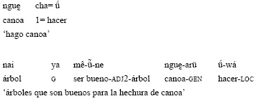 Una vez provisto de la marca deverbal, el morfema entra como modificador de un nombre en una construcción {Nnúcleo(Género Nmodificador)}. El sintagma resultante (no el elemento derivado) puede ocupar los mismos lugares de los nombres como sujeto, objeto o complemento. Otros ejemplos dentro de oraciones, con el verbo intransitivo {tâ-} 'ser.grande' + marca deverbal {_kü} o {_} 10.