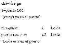 Los nombres de lugares son un caso particular; reciben marcas argumentales cuando afijan caso locativo. La localización es usualmente un tipo de esquema predicativo con características morfosintácticas particulares y privilegiadas, pues la localización de entidades es igualmente importante que las acciones de esas entidades o sus propiedades y características (Lyons, 1988, p. 417). En tikuna, los nombres de lugar acompañados del sufijo locativo inesivo ('en') reciben argumento y no requieren cópula ni verbo. La predicación locativa puede hacerse de forma sintética (una unidad) o de forma analítica (dos unidades yuxtapuestas); en este caso, requiere de "medidas adicionales" manifestadas en la presencia del nominalizador {-kü}: