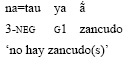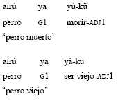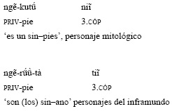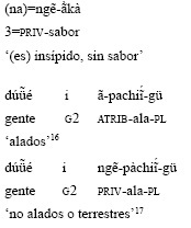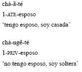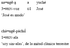 Conceptos que en otras lenguas se expresan a través del léxico, se expresan en esta lengua a través de la construcción privativo o atributivo + N ligado: soltero, casado, huérfano, alado, cojo, ciego, mudo, insípido. Se considera que estas son propiedades de alguna entidad con la que se deben poner en relación.