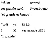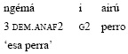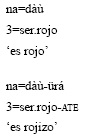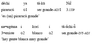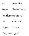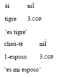 En tikuna no es posible "*na-áí": 'es tigre, se comporta como tigre'. Construcciones de este tipo se han descrito para otras lenguas colombianas. En nasa yuwe o paez (Nieves, 1994, p. 549), radicales nominales estrictos como 'ser paez' (designación étnica) o 'es una casa' reciben marcas argumentales (que incluyen la modalidad) y no requieren cópula para la predicación nominal, pero los del primer grupo (nominales estrictos) son incompatibles con el aspecto, los cambios de valencia y el imperativo: