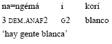 La negación y los demostrativos anafóricos son morfemas gramaticales que reciben argumentos y que expresan la carencia de algún elemento (con posibilidad de graduarla aspectualmente: no hay, casi no hay). Los demostrativos son un paradigma que cruza género y animacidad, y sobre estos se construye la predicación de existencia de las entidades. Se expresan así de manera obligatoria las características nominales de la entidad sujeto cuya existencia se predica. Estos elementos no son miembros centrales ni prototípicos de la clase verbos, pero comparten con estos el carácter predicativo.