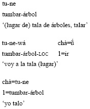 La incorporación de un nombre ligado clasificador a un verbo (transitivo en este caso) permite, en tikuna, crear nombres de acciones, de lugares en los que habitualmente se realizan acciones o nombres de actividades usuales. Una expresión v+n, con incorporación, solo requiere un argumento pronominal para ser predicativa; conserva el carácter predicativo que le da el verbo: