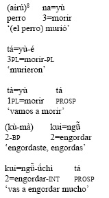 Los verbos que designan propiedades (ser gordo, ser viejo-madurar, ser rojo) tienen las mismas marcas y contextos que cualquier otro verbo intransitivo (morir); y reciben marcas aspectuales (prospectivo, atenuativo, intensificador) y de cambio de valencia (aplicativo) propias de los verbos plenos, como 'morir' que presenta concordancia de persona y número, y recibe marcas aspectuales: