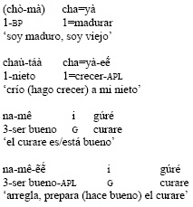 Finalmente, verbos que designan propiedades como 'ser viejo' (visto como proceso de crecimiento) y 'ser bueno', reciben el aplicativo, morfema que adiciona un argumento y que es uno de los elementos definitorios de los verbos plenos. Se obtienen, respectivamente, 'criar a alguien' (hacer madurar) y 'arreglar, preparar algo'.