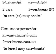 Cuando el modificado es un nombre ligado11, existe la opción de hacer una construcción compuesta con incorporación del nombre al verbo. El argumento (poseedor) del nombre ligado (segunda persona para 'tu cara') se promociona a sujeto de intransitivo en la construcción incorporada12. Sin incorporación: