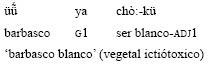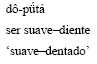 La incorporación de nombres clasificadores a algunos verbos intransitivos, los que designan propiedades, es una construcción muy recurrente que permite hablar (en abstracto) de la propiedad adscrita a la forma, postura, materia, configuración, agrupación. El ejemplo a continuación puede referirse a los dientes blandos de algún humano o animal, o a una variedad de maíz de grano suave o a cualquier otro elemento (previamente presentado) que tenga forma dentada-granulada y consistencia suave: