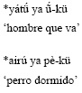Esta posibilidad no existe para todos los verbos: 'ir' y 'dormir' no tienen incorporación13. Es una evidencia de que el conjunto de verbos intransitivos no es igual, pues solo una parte de estos es derivable para obtener una palabra, elemento modificador, con el proceso ya descrito: