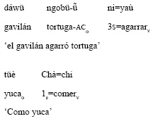 De manera similar lo hace el uitoto: "en el esquema holofrástico la base léxica no está restringida a bases verbales, ocasionalmente su lugar puede estar ocupado por una base nominal, pronominal, interrogativa, atributiva o un numeral" (Petersen, 2004-2005, p. 148). Esa base de predicación, más el morfema predicativo {-dɨ}, recibe las marcas argumentales. El tikuna parece extender menos la licencia a este tipo de ocurrencias a tan diversas clases gramaticales.