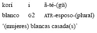 La forma resultante, "ã-té-(gü)" 'casada(s)', es un elemento modificador similar a los que se obtienen con {_kü} y su alomorfo. Con un nombre libre puede entrar en las construcciones típicas de los nombres, ser sujeto, objeto o complemento, como lo hace el elemento obtenido con {_kü} y su alomorfo.