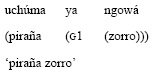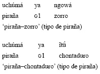 Un nombre libre puede modificar a otro nombre libre en una construcción productiva para la lexicogenia, en particular para denominar variedades de vegetales o de animales por comparación, como es el caso de la 'piraña-zorro'. Otros determinantes (numerales, demostrativos, cuantificadores) se anteponen. El nombre que modifica antepone la marca de género: