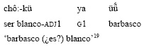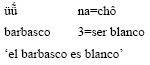Si los adjetivos predicativos codificados como verbos intransitivos modifican un nombre ligado18 (inalienable), existe la opción de hacer una construcción compuesta con incorporación del nombre al verbo intransitivo que denota propiedad o cualidad. El orden es en ese caso estricto. Adj + N: